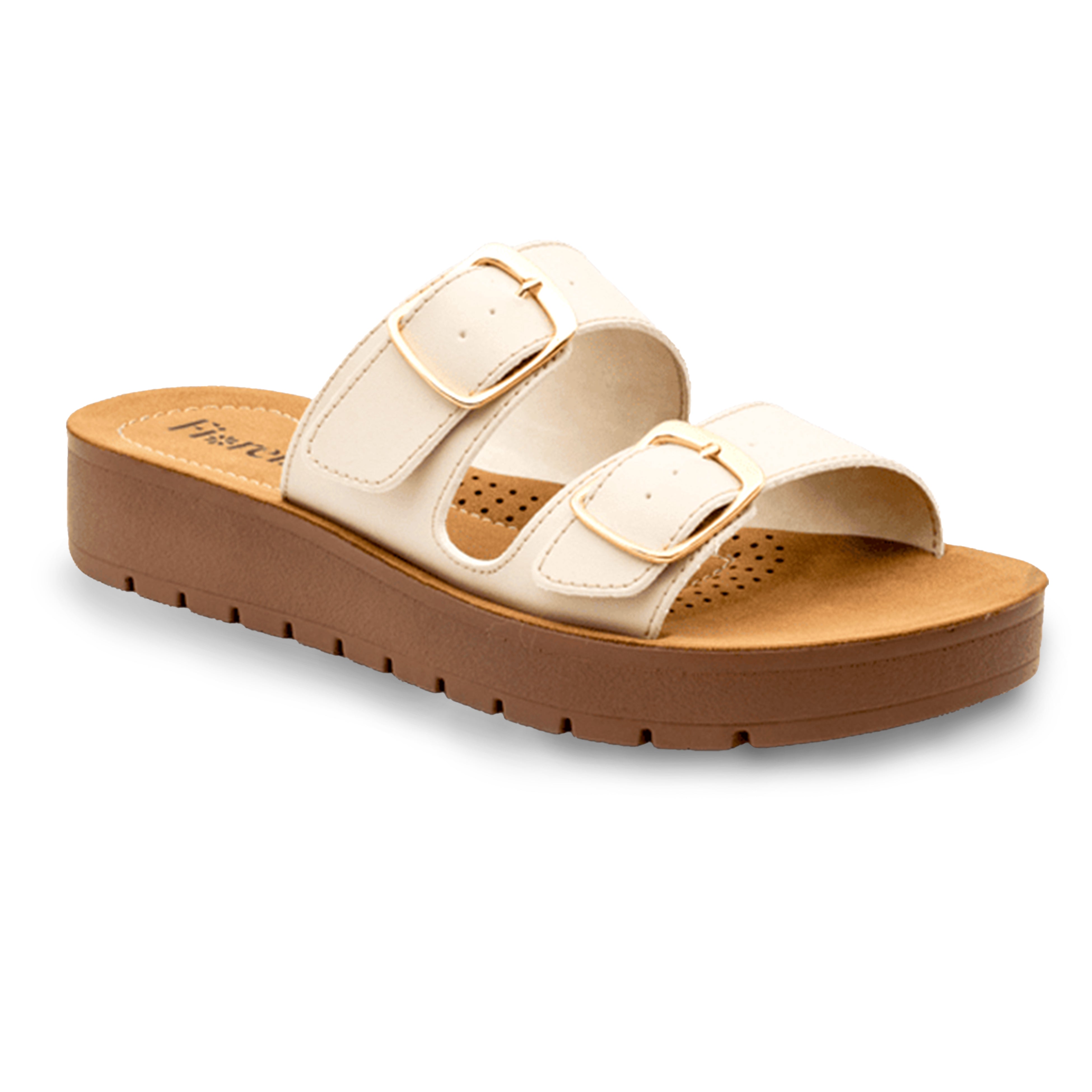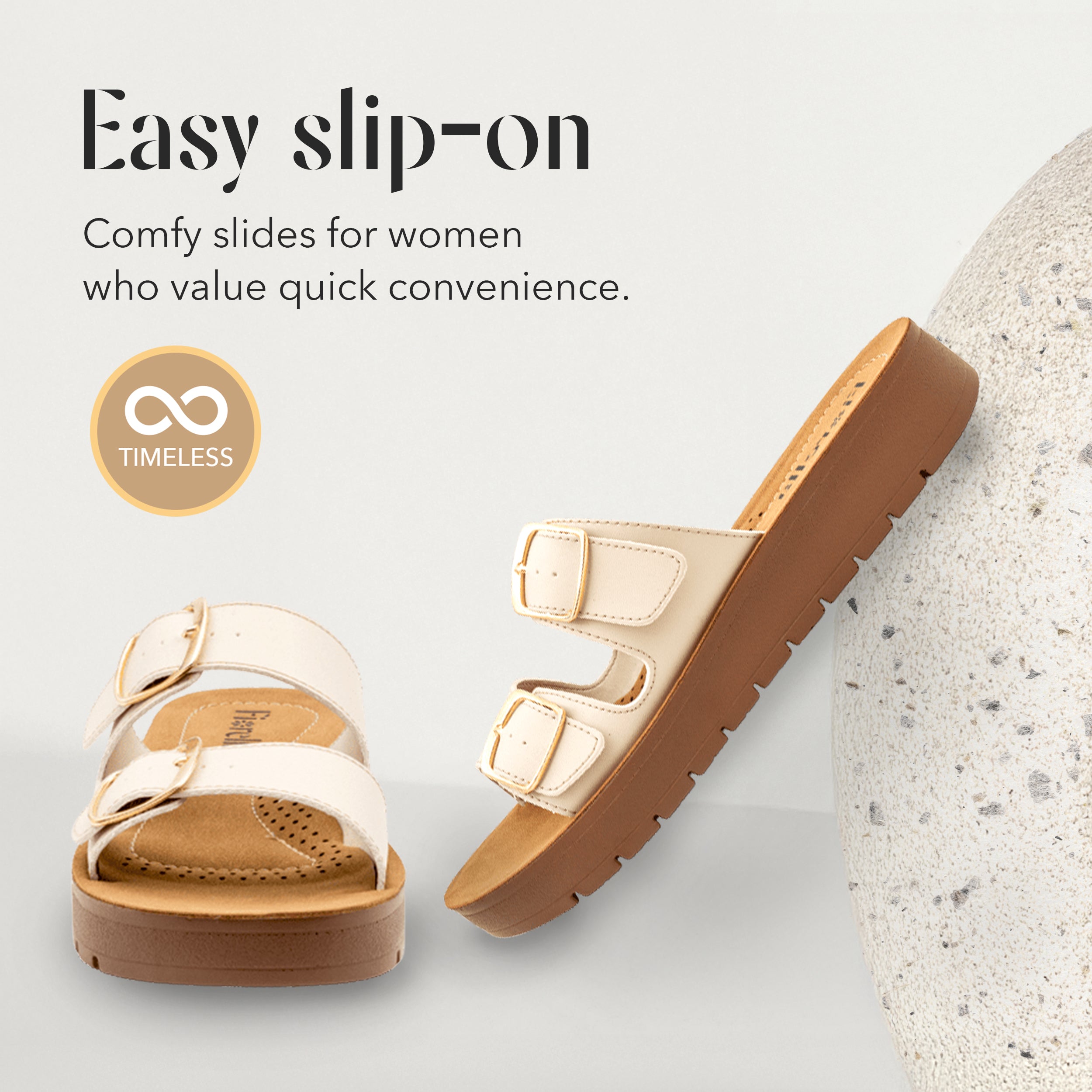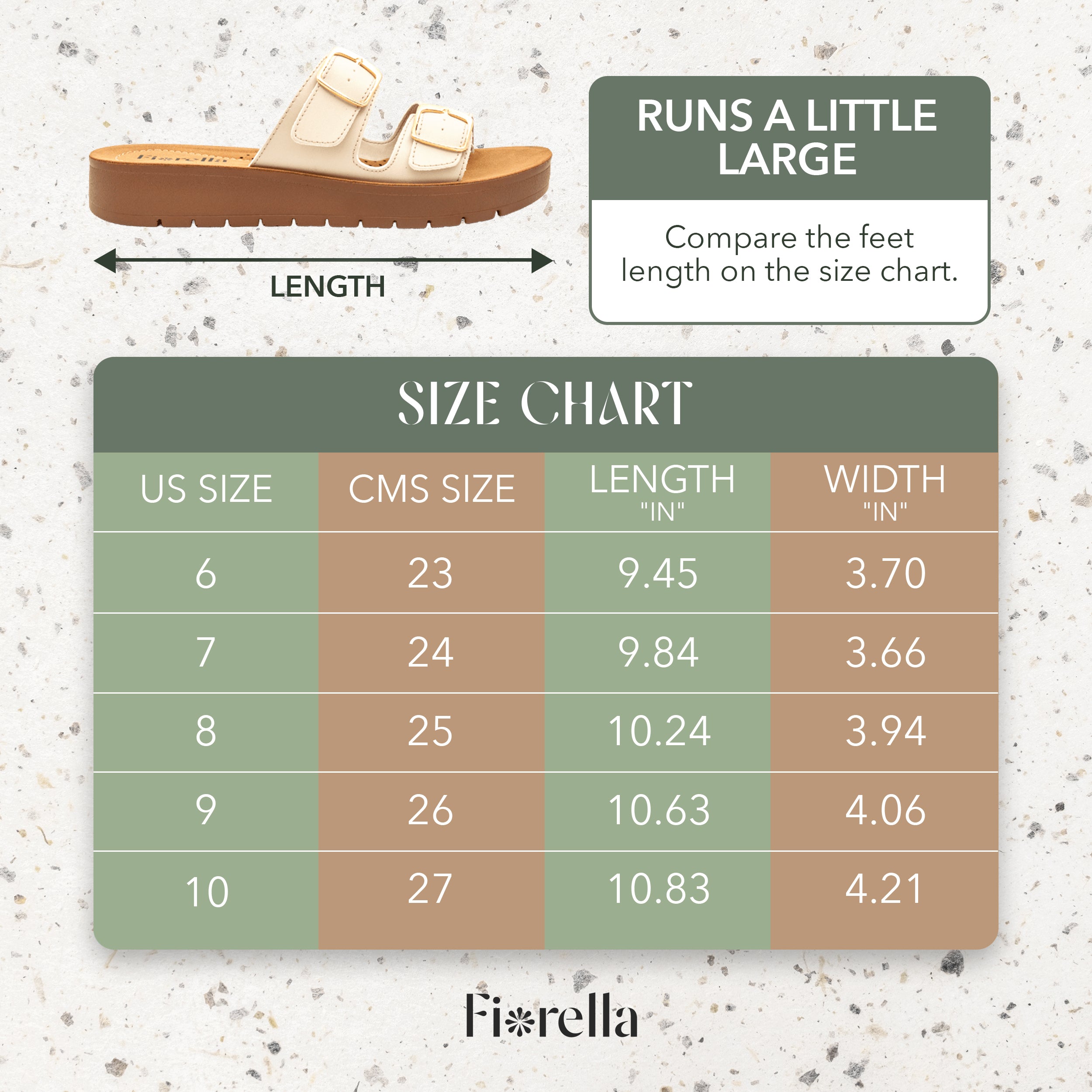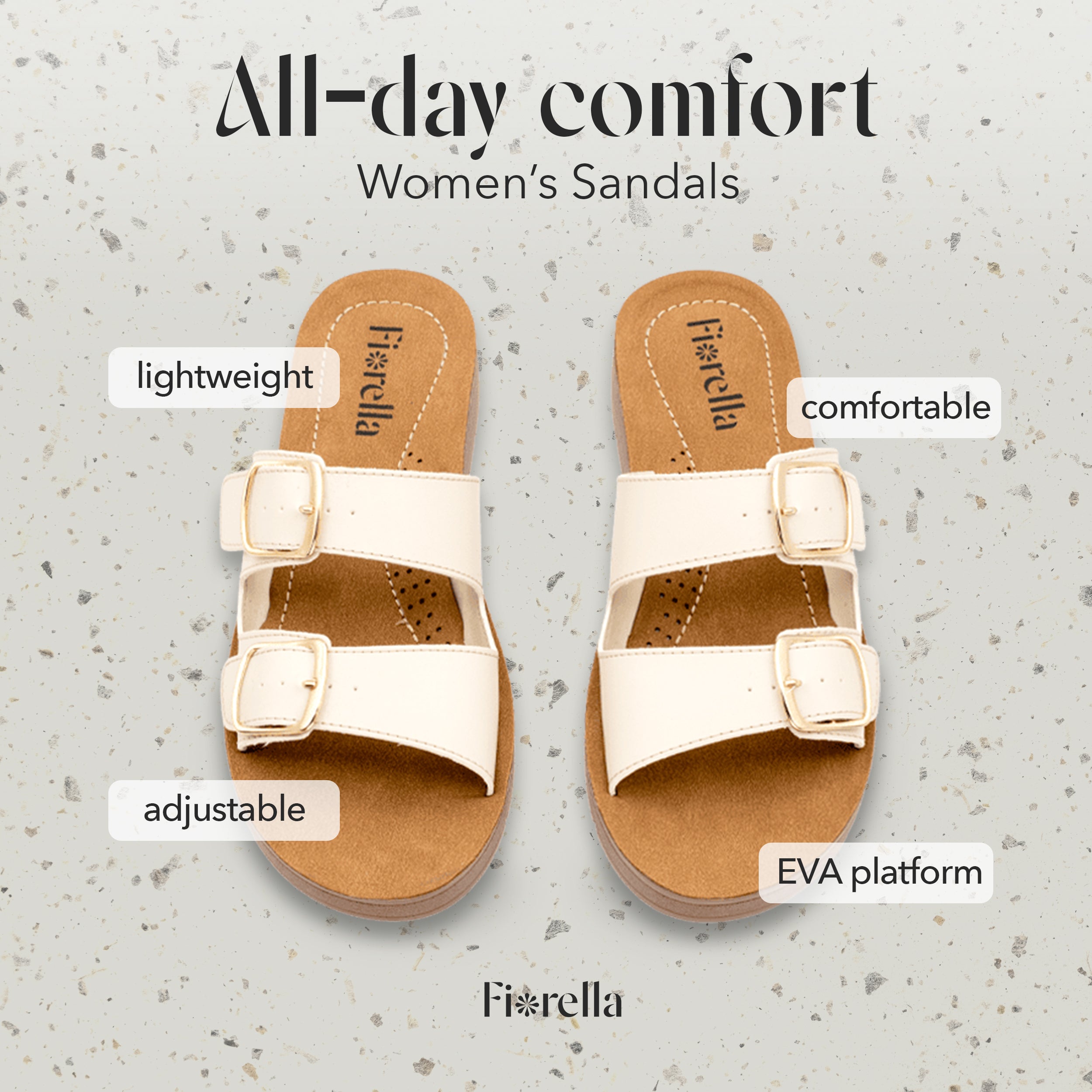 A lightweight 1.5" EVA platform cushions every step for all-day support, while two wide buckle straps adjust to narrow or wide feet so you can slip in and go—perfect for errands, travel, or beach days. The smooth vegan-leather upper feels soft, wipes clean, and pairs with denim or dresses. Available in Black, White, Camel, Latte, Gold, and Red; US women’s 6–10 (no half sizes), standard width, runs a little large—if you’re between sizes, order down.