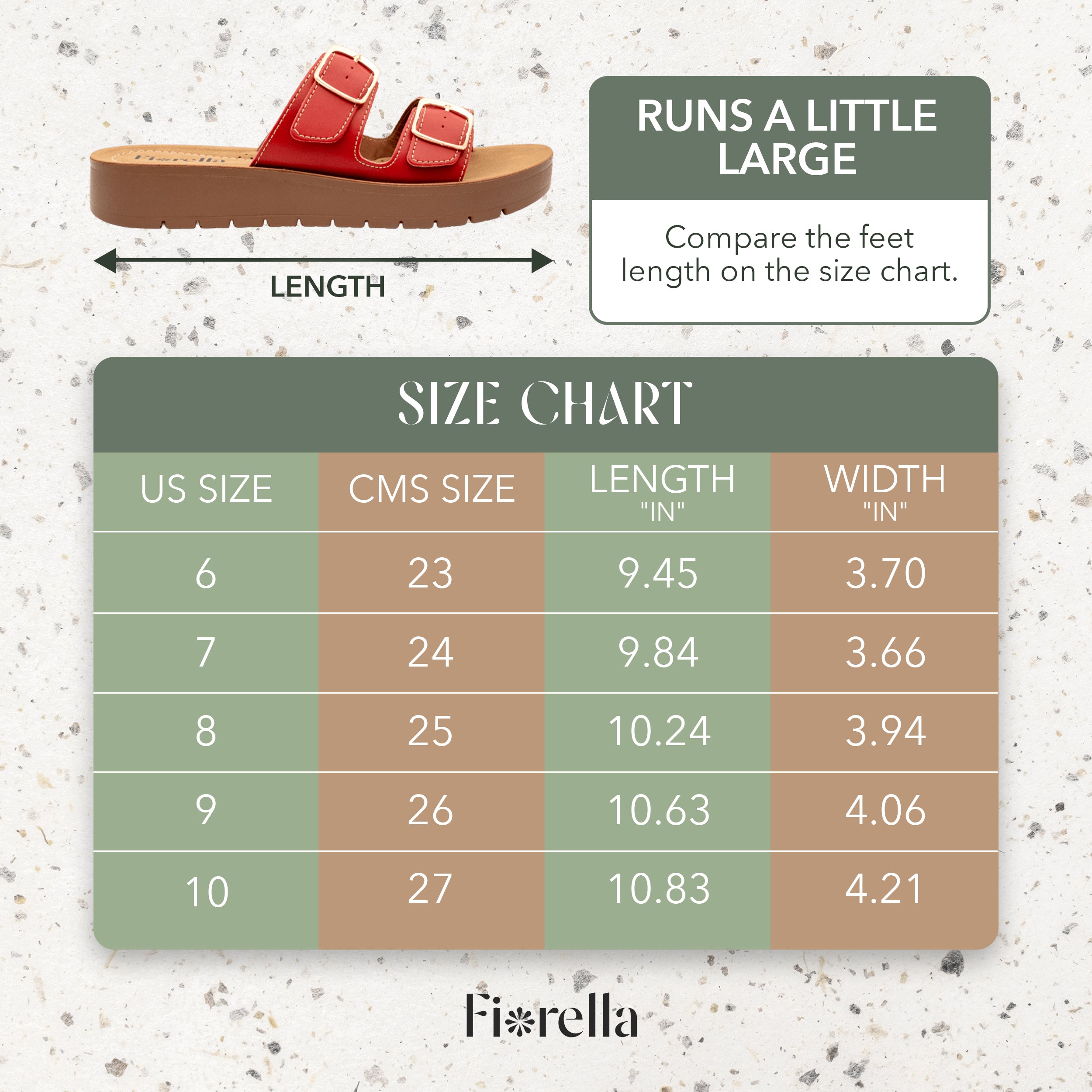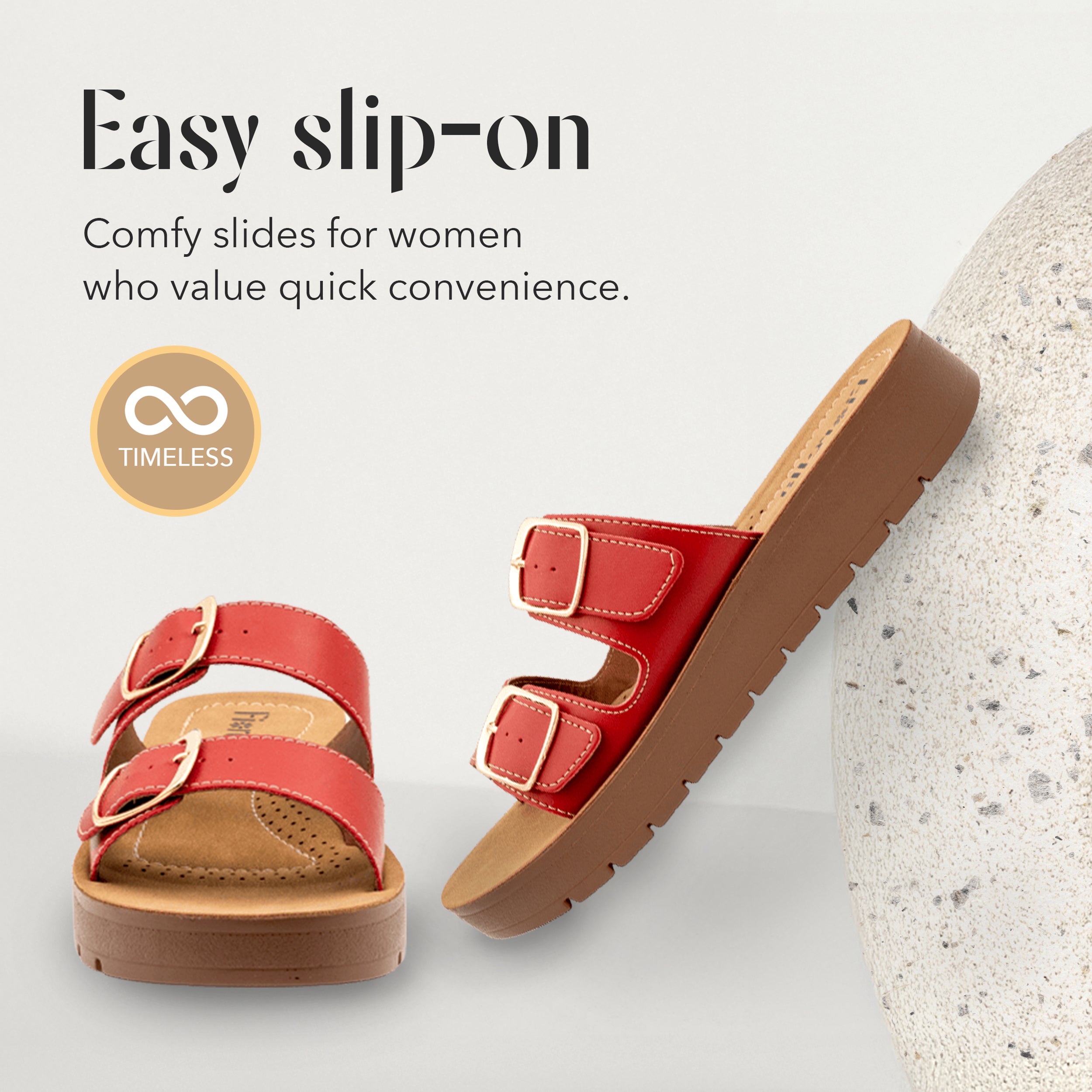 A lightweight 1.5" EVA platform cushions every step for all-day support, while two wide buckle straps adjust to narrow or wide feet so you can slip in and go—perfect for errands, travel, or beach days. The smooth vegan-leather upper feels soft, wipes clean, and pairs with denim or dresses. Available in Black, White, Camel, Latte, Gold, and Red; US women’s 6–10 (no half sizes), standard width, runs a little large—if you’re between sizes, order down.