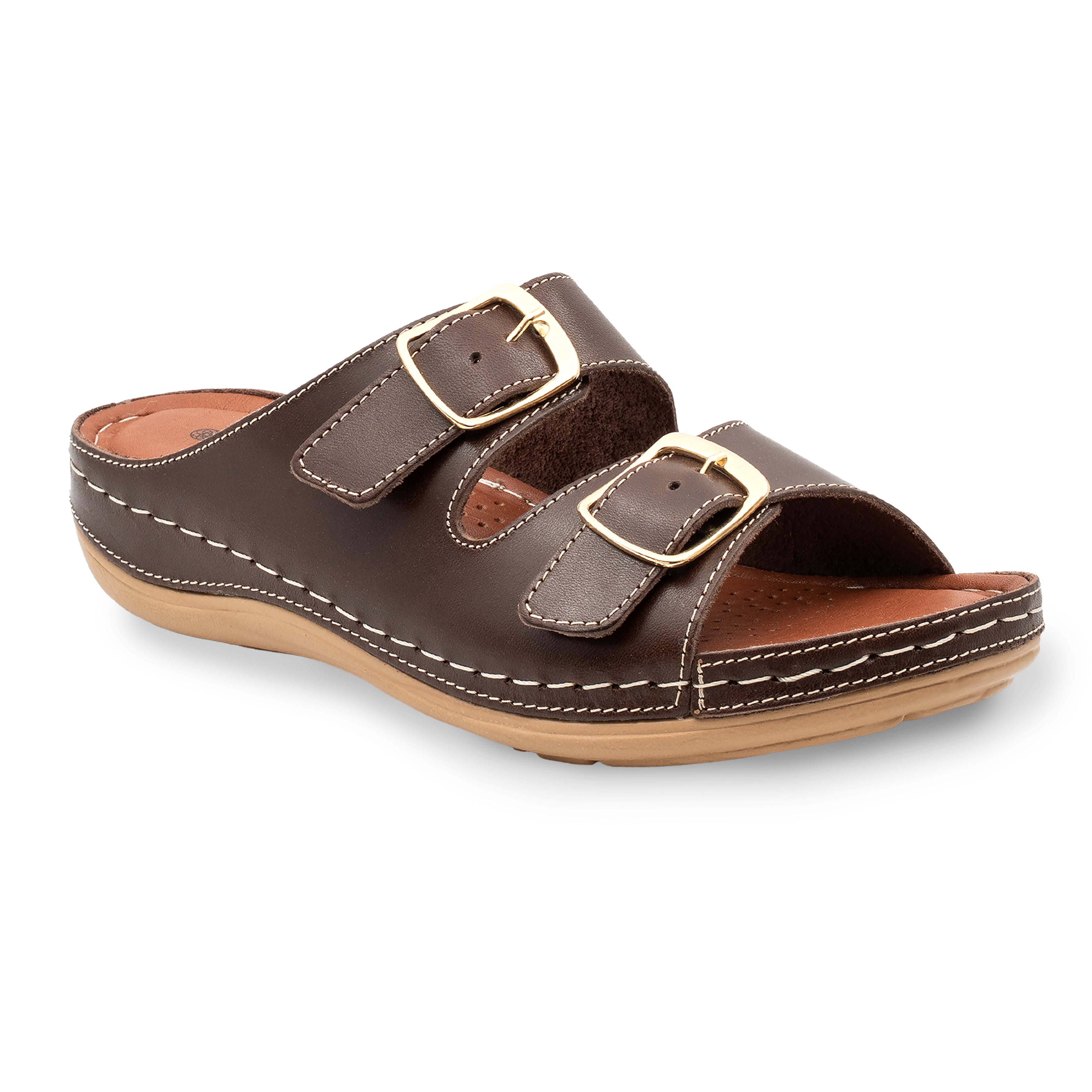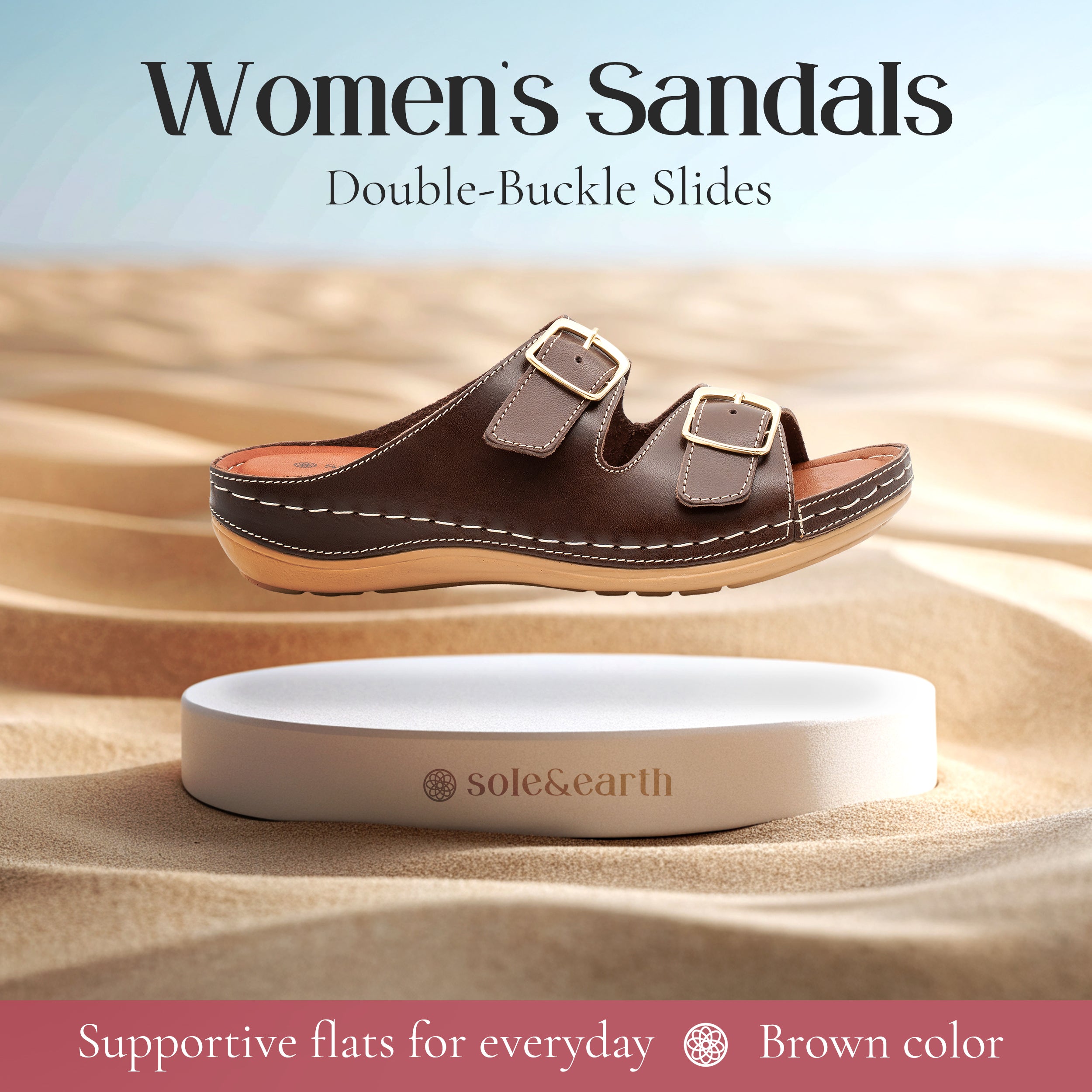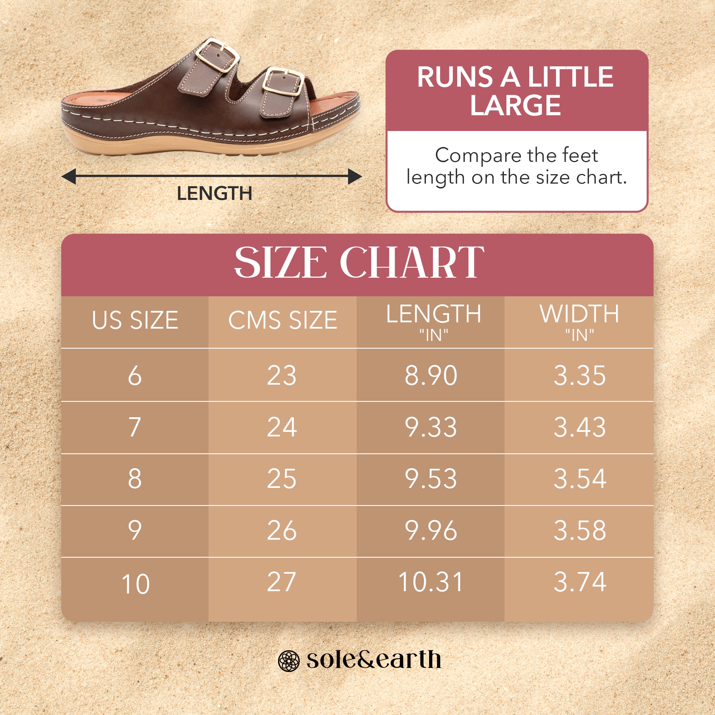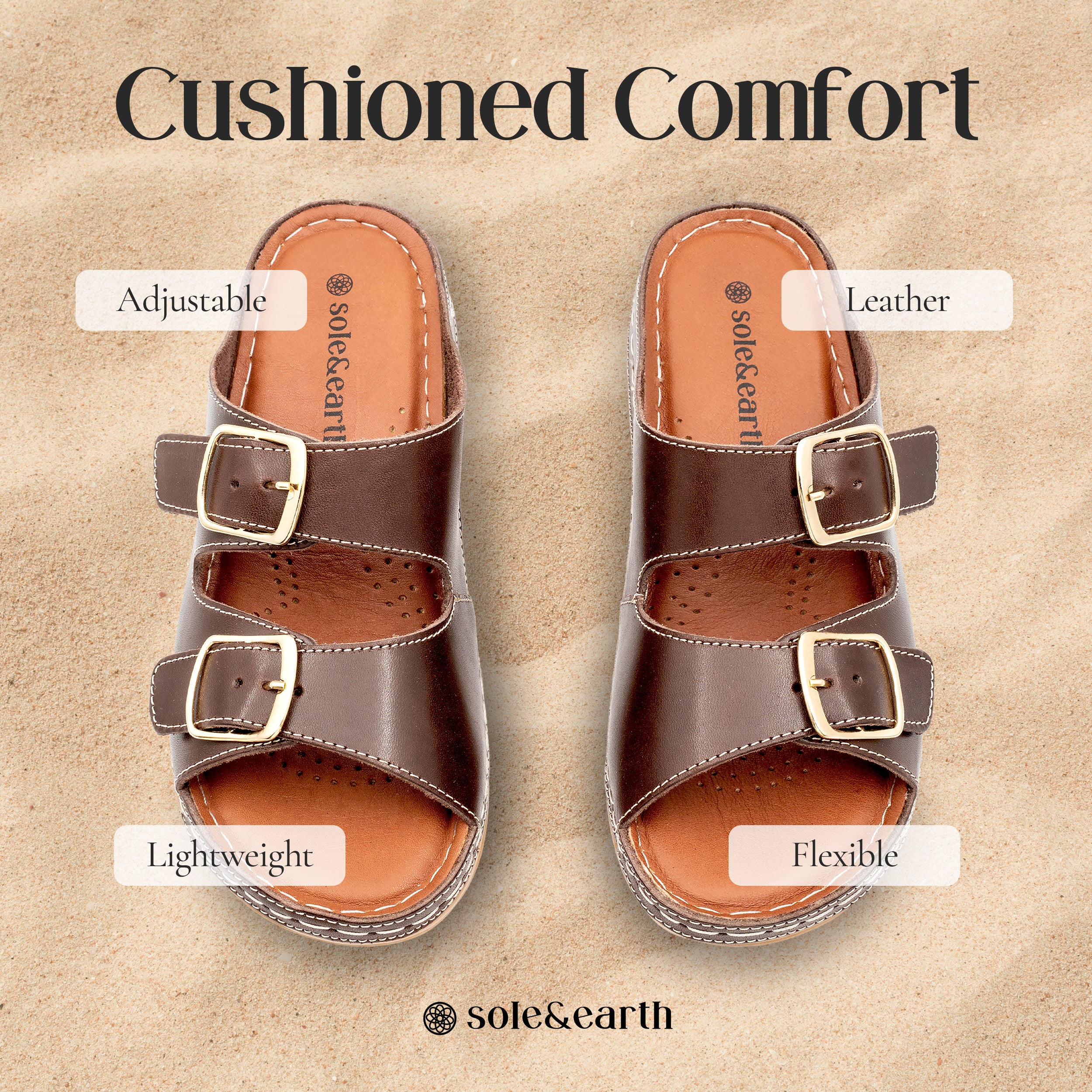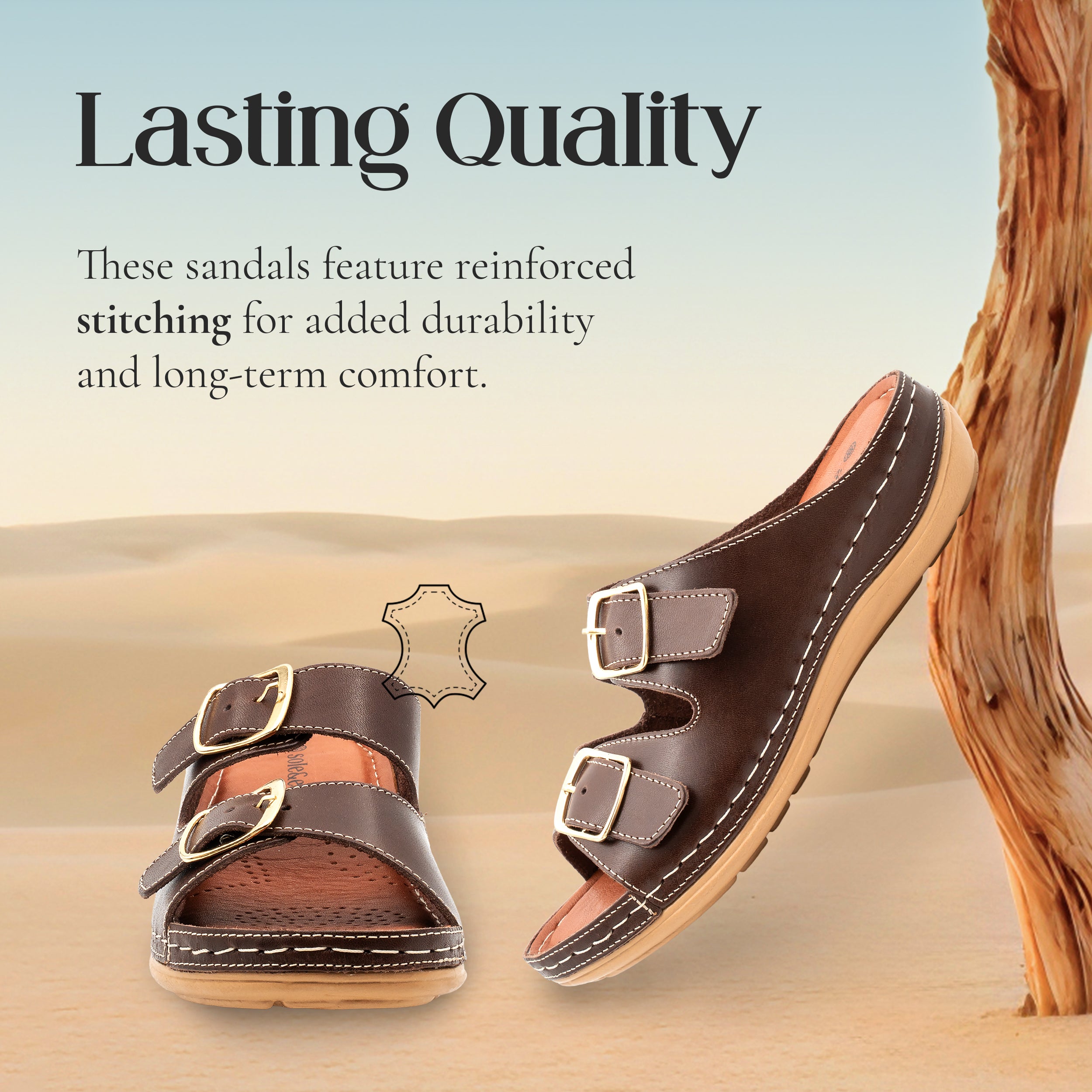 Walk easy with a contoured foam footbed and soft suede lining that cushion every stride. Premium full-grain leather molds to your foot, and two adjustable metal buckles fine-tune the fit for narrow or wide feet. A feather-light, grippy EVA outsole stays stable on café tiles and boardwalks without weighing you down. Available in Off-White, Cocoa Brown, Warm Tan, Earthy Red, and Classic Black; US women’s 6–10, true to size—effortless with denim, linen, or day dresses.