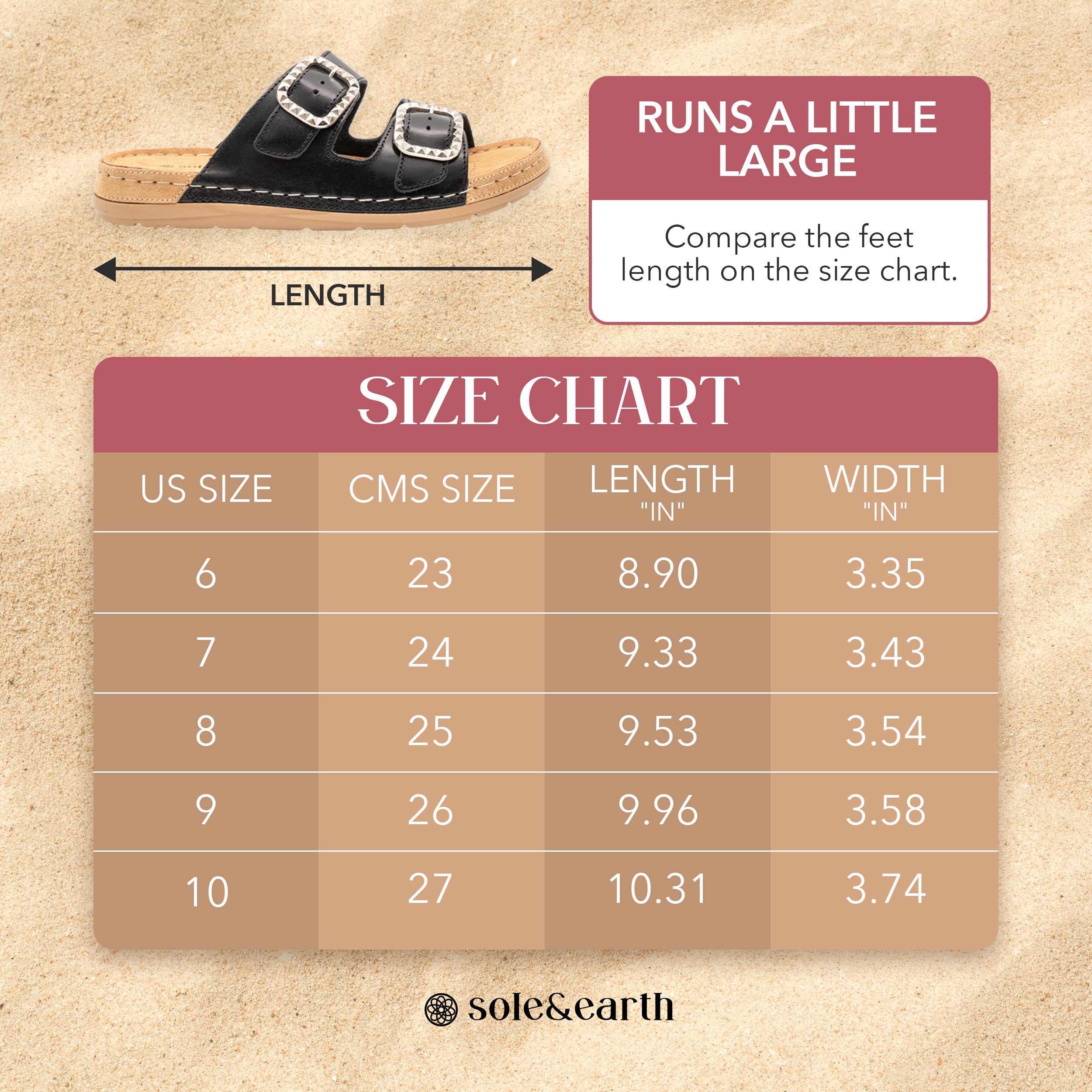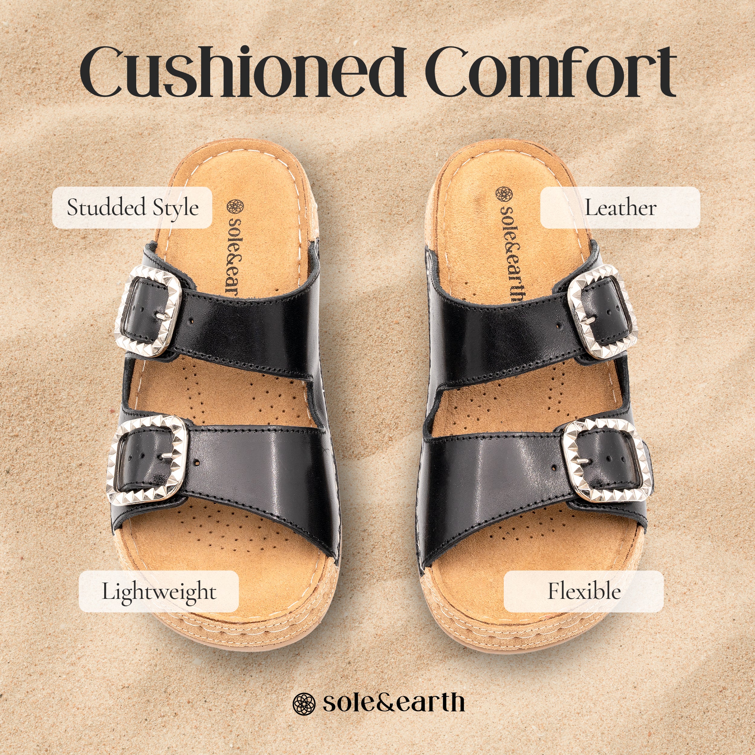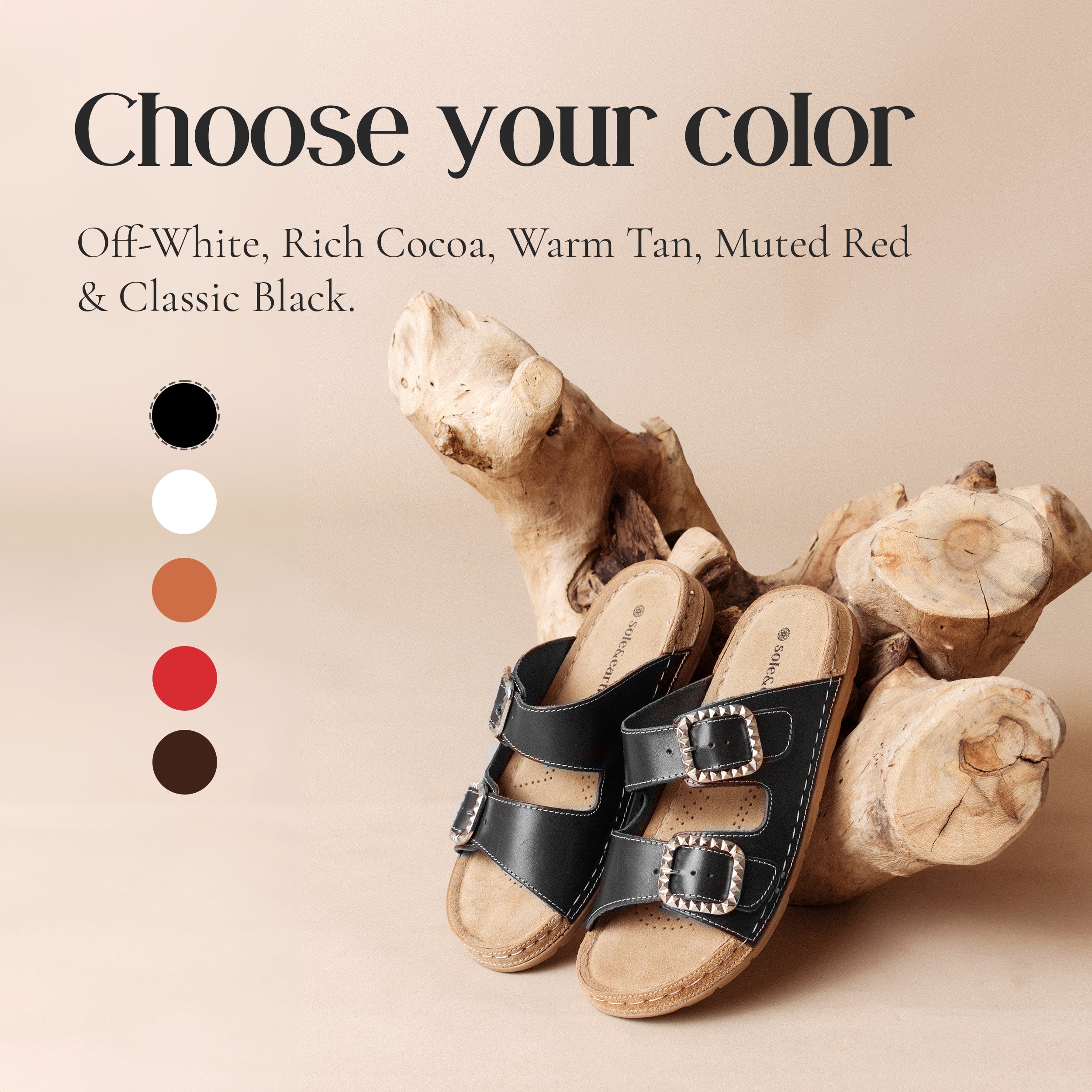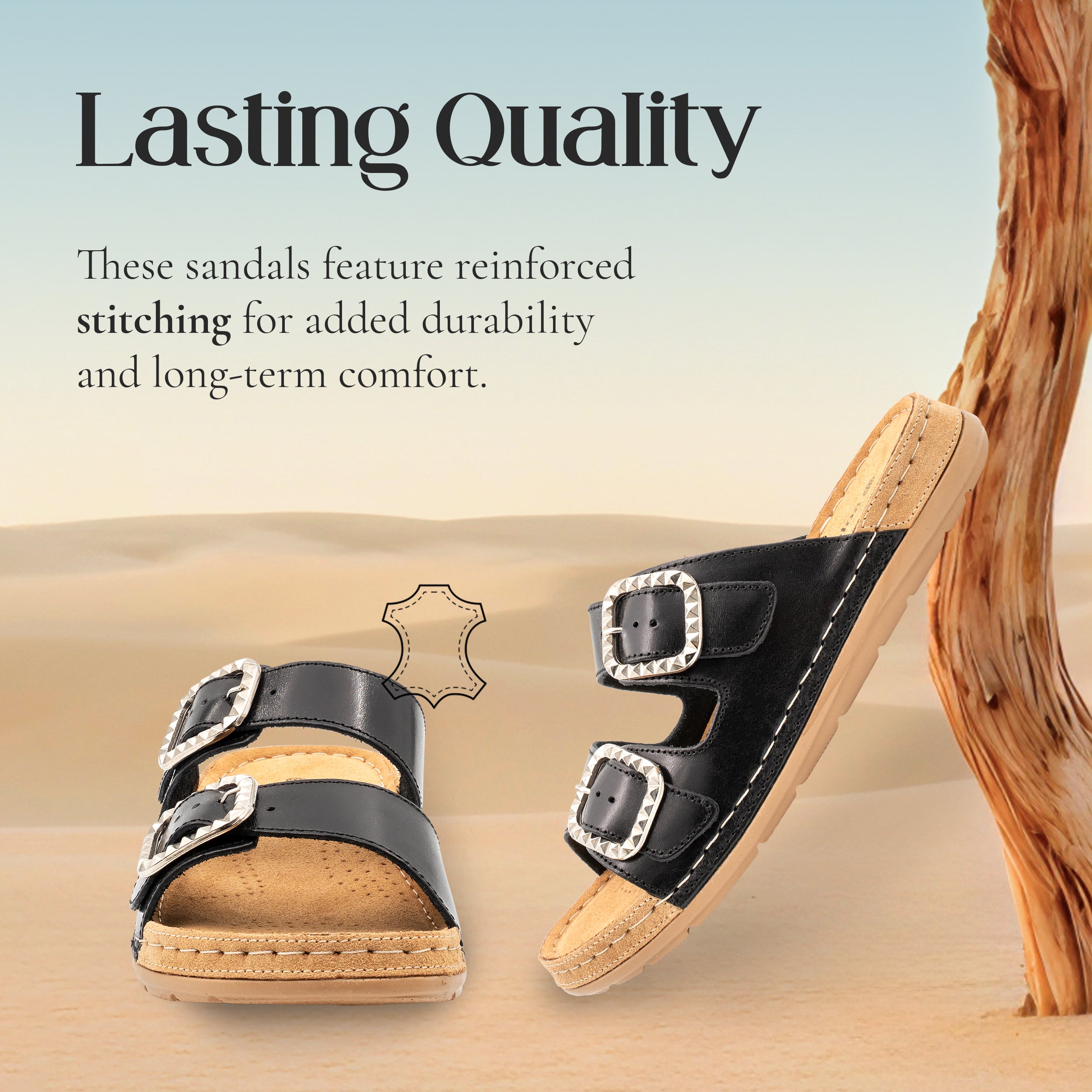 A suede-lined, foam-cushioned footbed contours to your arch and softens every step—from errands to sightseeing—while dual adjustable straps with pyramid-stud buckles add a subtle edge and an easy fit for narrow or wider feet. The full-grain leather upper ages beautifully with hand-stitched welt detail, and a feather-light, flexible EVA outsole grips boardwalks, tiled markets, and city sidewalks yet packs flat for travel. Available in Two-Tone Off-White, Cocoa Brown, Warm Tan, Earthy Red, and Classic Black; US women’s 6–10 (no half sizes), standard width, runs a little large—if you’re between sizes, order down.